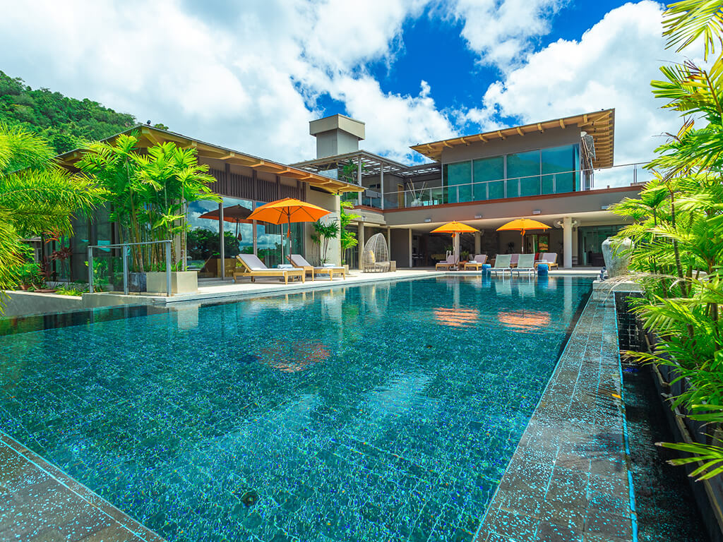 This impressive villa, located in picturesque Thailand, is inspired by the modern minimalist style, whichcombines elegance, functionality, and harmony with the natural surroundings. It is a true oasis of moderncomfort and luxury seamlessly integrated into the tropical landscape. The facade of the house is adornedwith large glass panels, creating a sense of boundless transparency and allowing natural light to penetratethe interior throughout the day. The external landscape also includes spacious terraces, small infinity-edge pools, and beautifully landscaped tropical gardens with lush greenery, creating a sense of seclusionand tranquility.